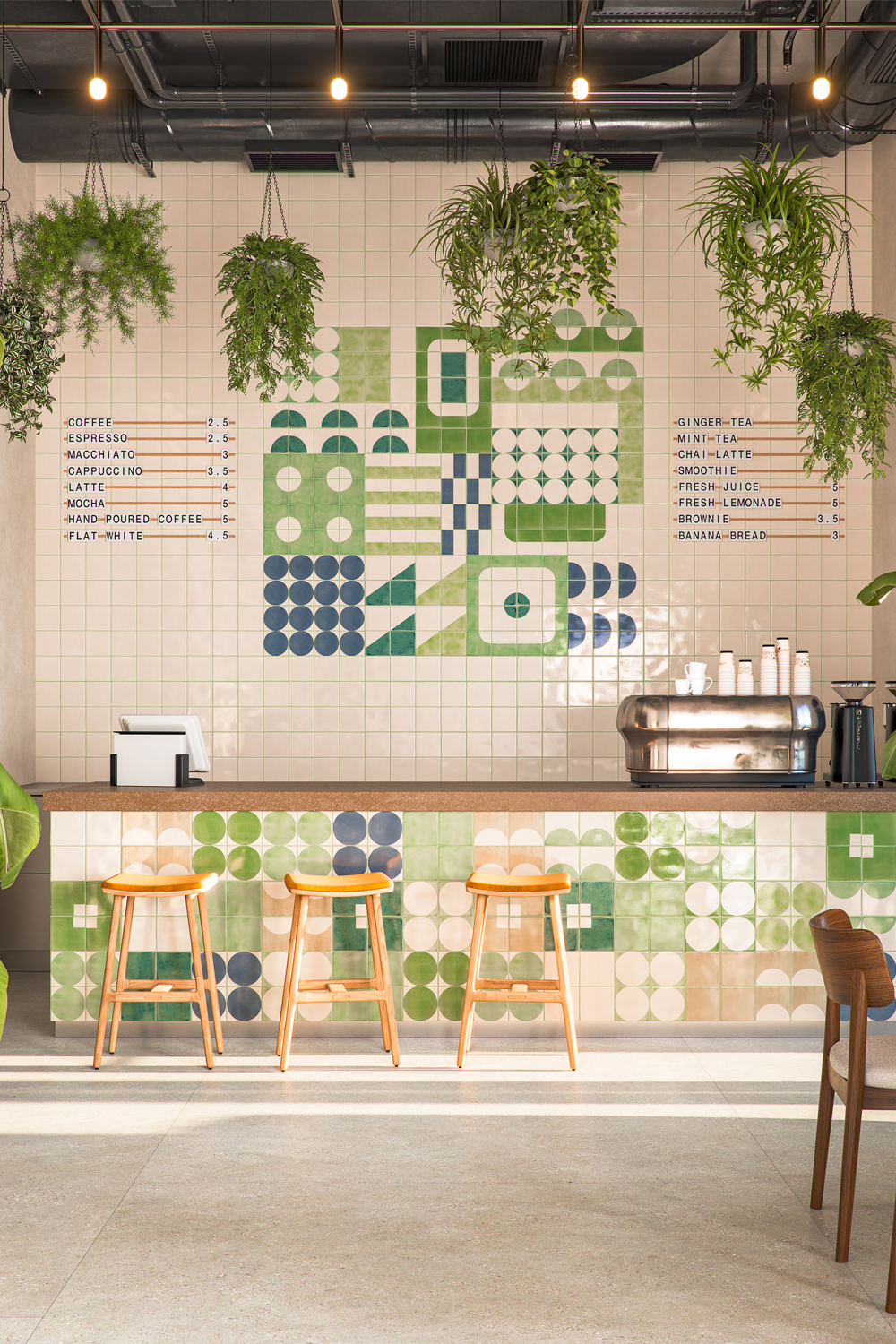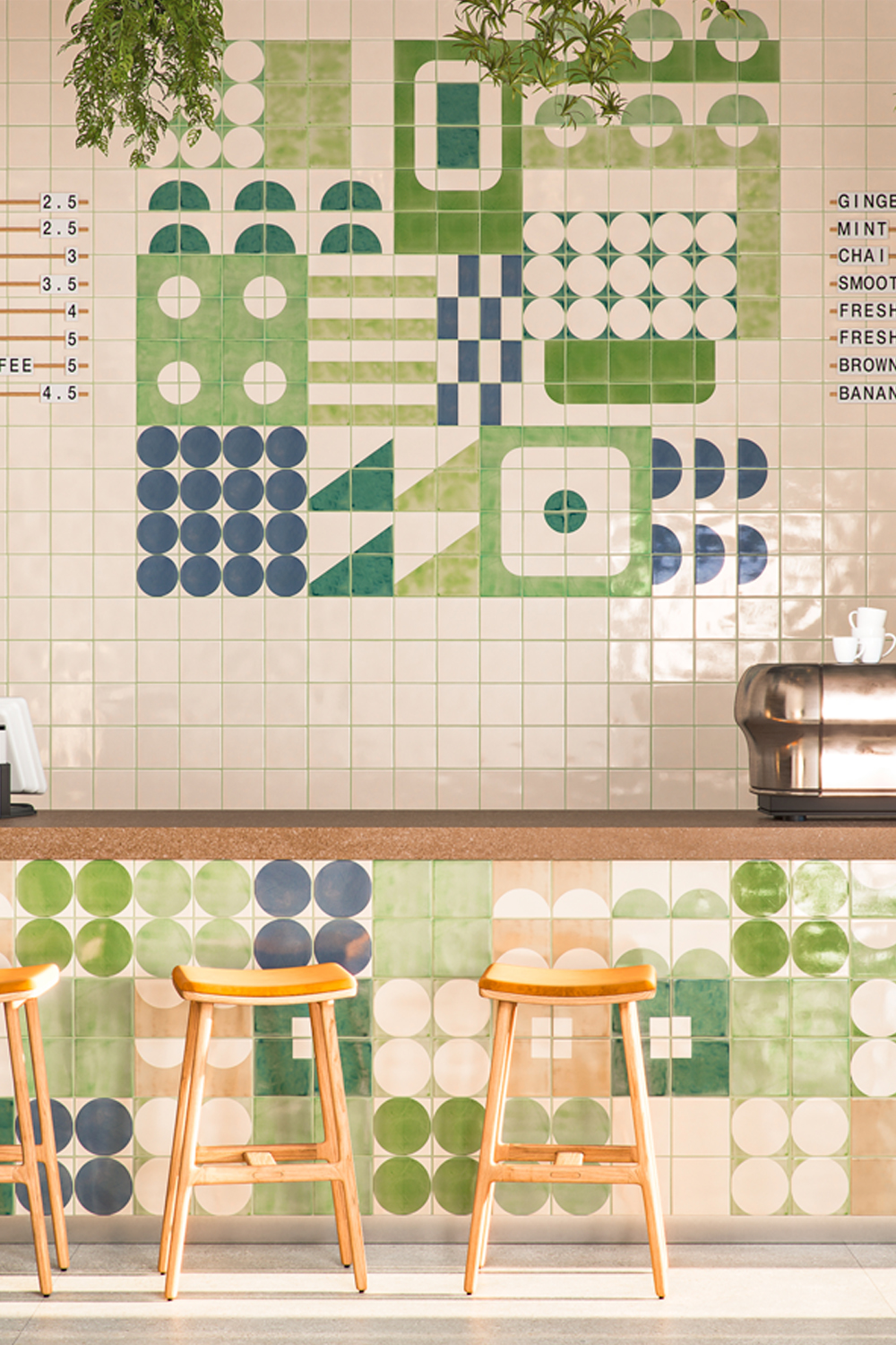 To this day, the lines and block colours of mid-century modern and Bauhaus design exert a huge influence on graphic design. Handmade tiles can play with this, creating poster style installations with borders of solid glazed tiles around a custom screen-printed design. This Bauhaus poster design creates blocks within blocks, using different shapes to distinguish elements of the overall design. We see it as particularly suited to a spacious, industrial café where the slightly uneven surface of our handmade tiles can soften the impact of the hard surfaces and straight edges.