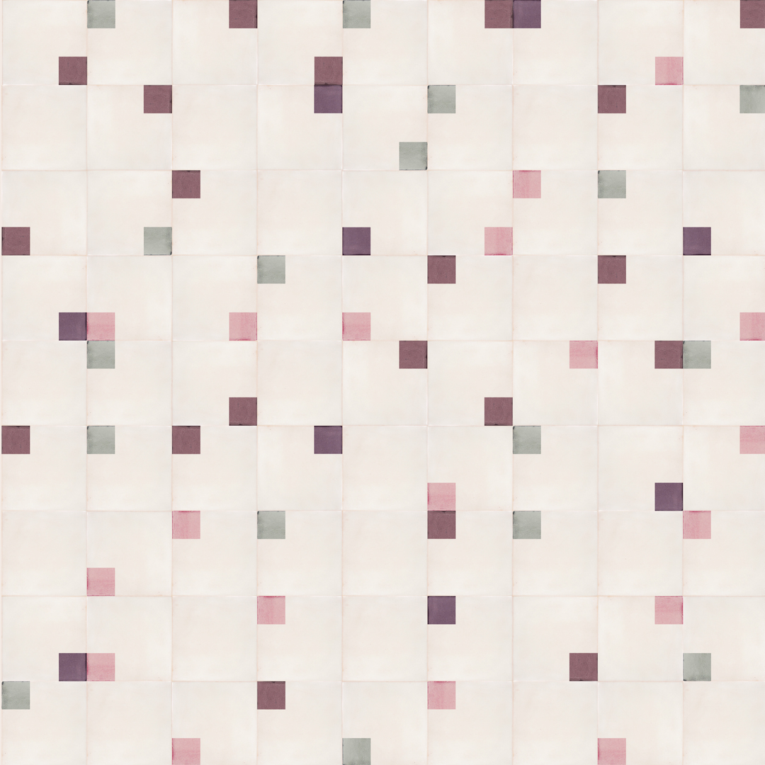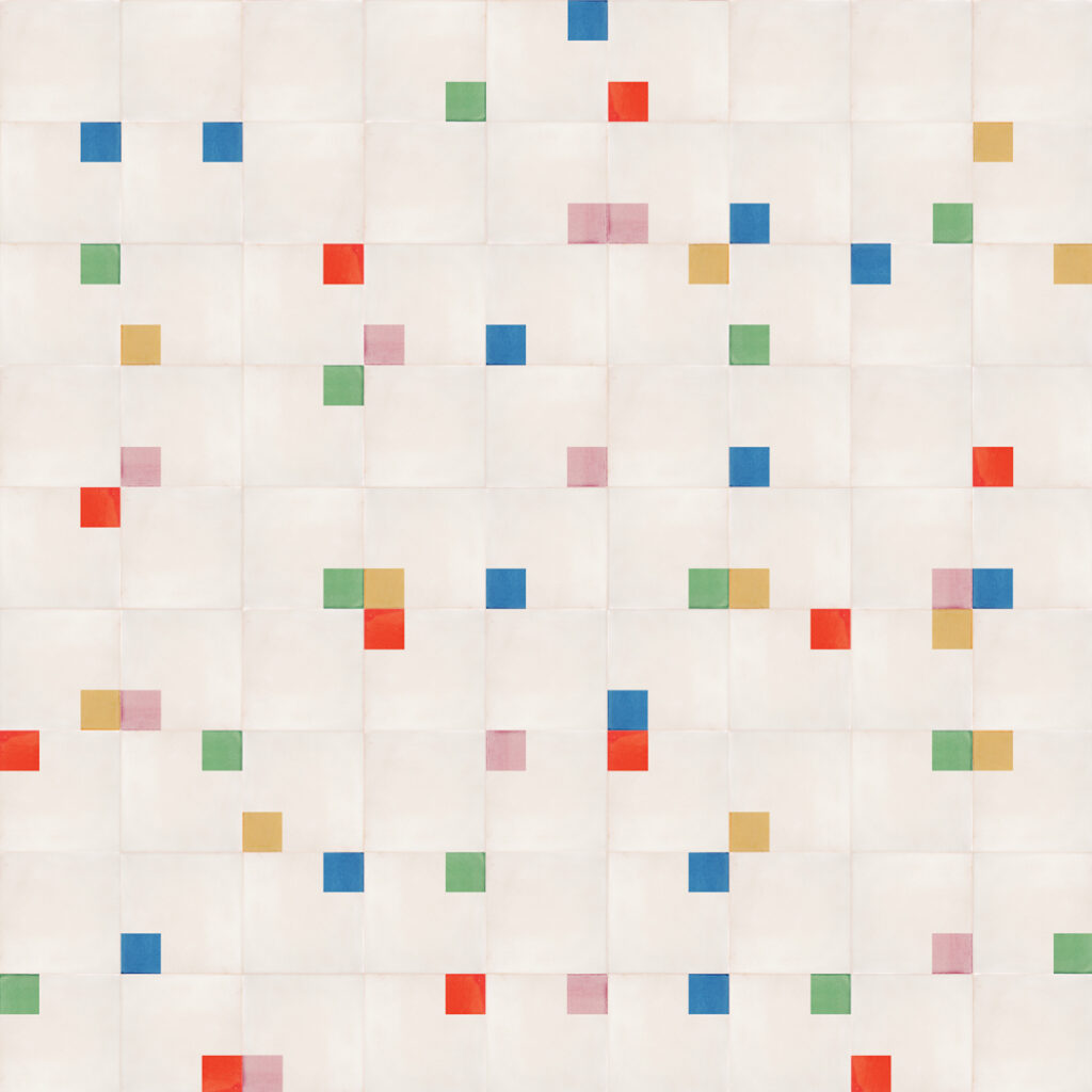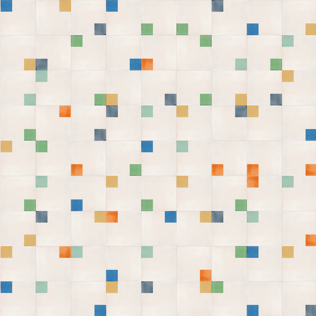 The name Scattered showers comes from the language of weather forecasts. They have their own meteorological mood, neither threatening nor cheerful, allowing you to paint your own feeling on to them. Using small squares of various colours like cobalt, red, sage and ochre, or just one, a watercolour black, this design offers a dispersed, random pattern that is nonethless contained, each coloured square in its own soft white box. Some are solitary, some briefly paired, as if caught mid-fall. The randomness is controlled; the composition breathes. It is an exercise in restraint and punctuation, each tile a drop of colour suspended just before it lands.
