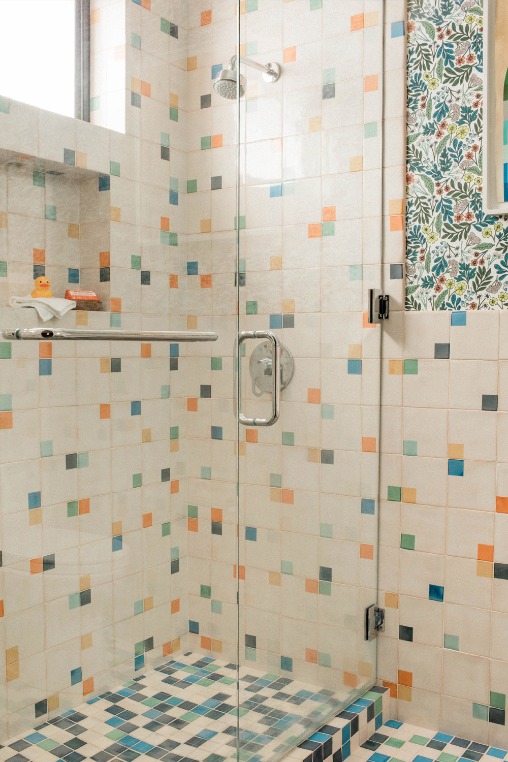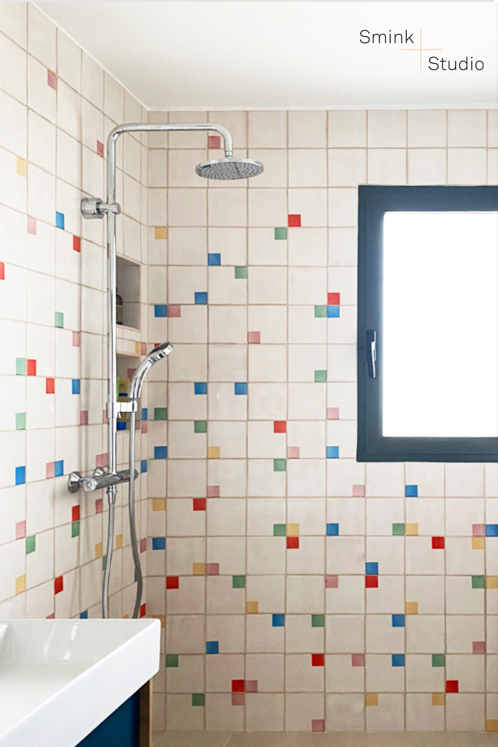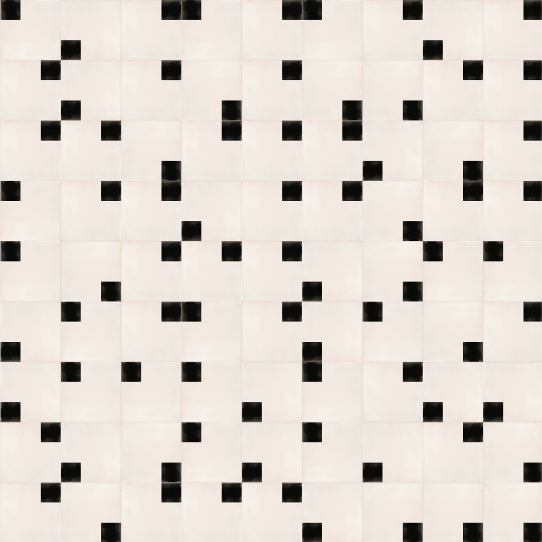 The name Scattered showers comes from the language of weather forecasts. They have their own meteorological mood, neither threatening nor cheerful, allowing you to paint your own feeling on to them. Using small squares of various colours like cobalt, red, sage and ochre, or just one, a watercolour black, this design offers a dispersed, random pattern that is nonethless contained, each coloured square in its own soft white box. Some are solitary, some briefly paired, as if caught mid-fall. The randomness is controlled; the composition breathes. It is an exercise in restraint and punctuation, each tile a drop of colour suspended just before it lands.